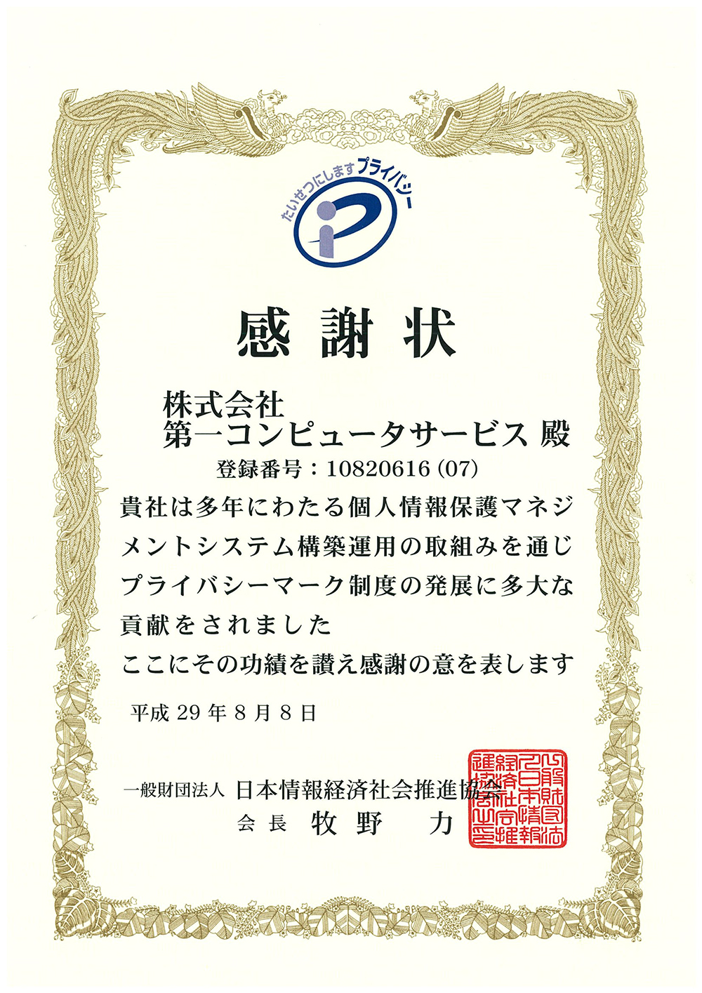 プライバシーマーク推進センターより多年にわたる貢献に対し感謝状を頂きました。